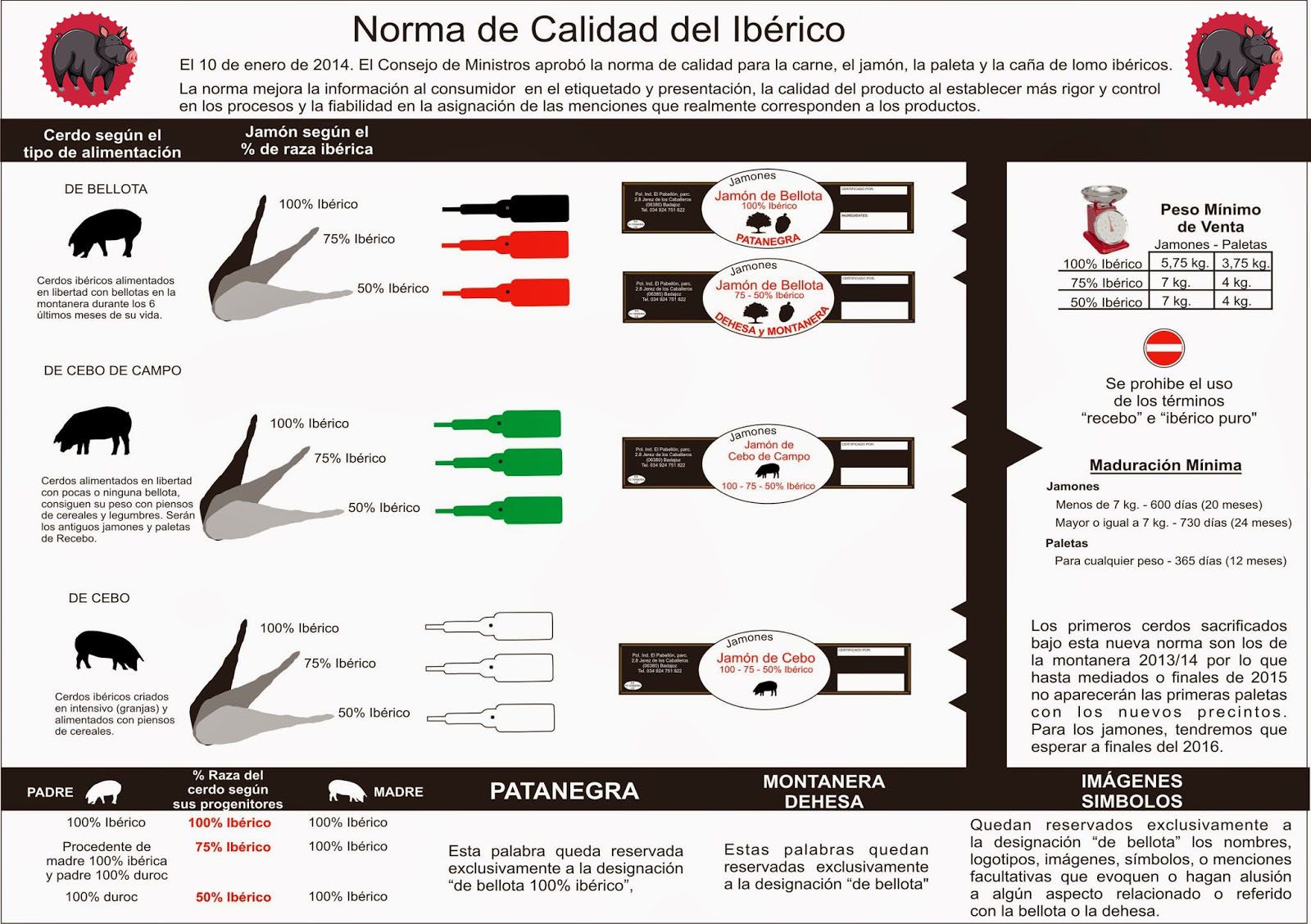 La Normativa del Jamón Ibérico, aprobada por el ministerio de Agricultura en el Real Decreto 4/2014 del 10 de Enero de 2014 trata de diferenciar aspectos sobre la pureza de la raza, la alimentación, su cría, etc. Estableciendo ahora solo 3 categorías para el jamón Ibérico, aunque se hace extensible a las paletas y lomos: Jamón Ibérico 100% Bellota, Jamón Ibérico Cebo de campo y Jamón Ibérico de Cebo.